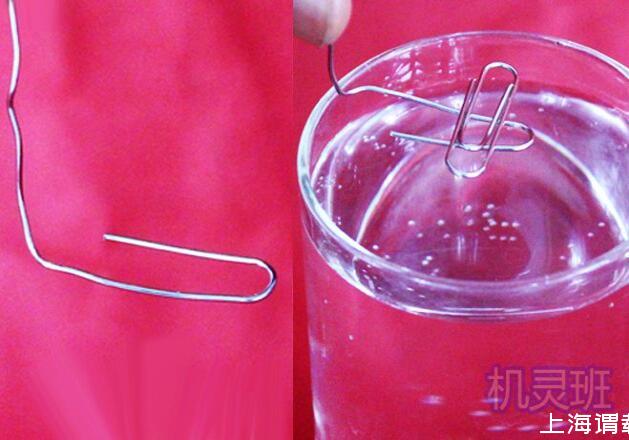 3、現在,將步驟2的整體回形針水平地慢慢地貼近水面,再輕輕抽走作為支架的回形針,則你會發(fā)現回形針漂浮在水面上。