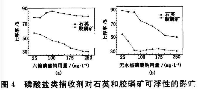 除了上述調(diào)整劑,含有磷酸根的六偏磷酸鈉及無(wú)水焦磷酸鈉也可抑制膠磷礦,這類(lèi)磷酸鹽除了可以在酸性條件下抑制膠磷礦外,還能在礦漿中起到一定的分散作用。試驗(yàn)結(jié)果見(jiàn)圖4。