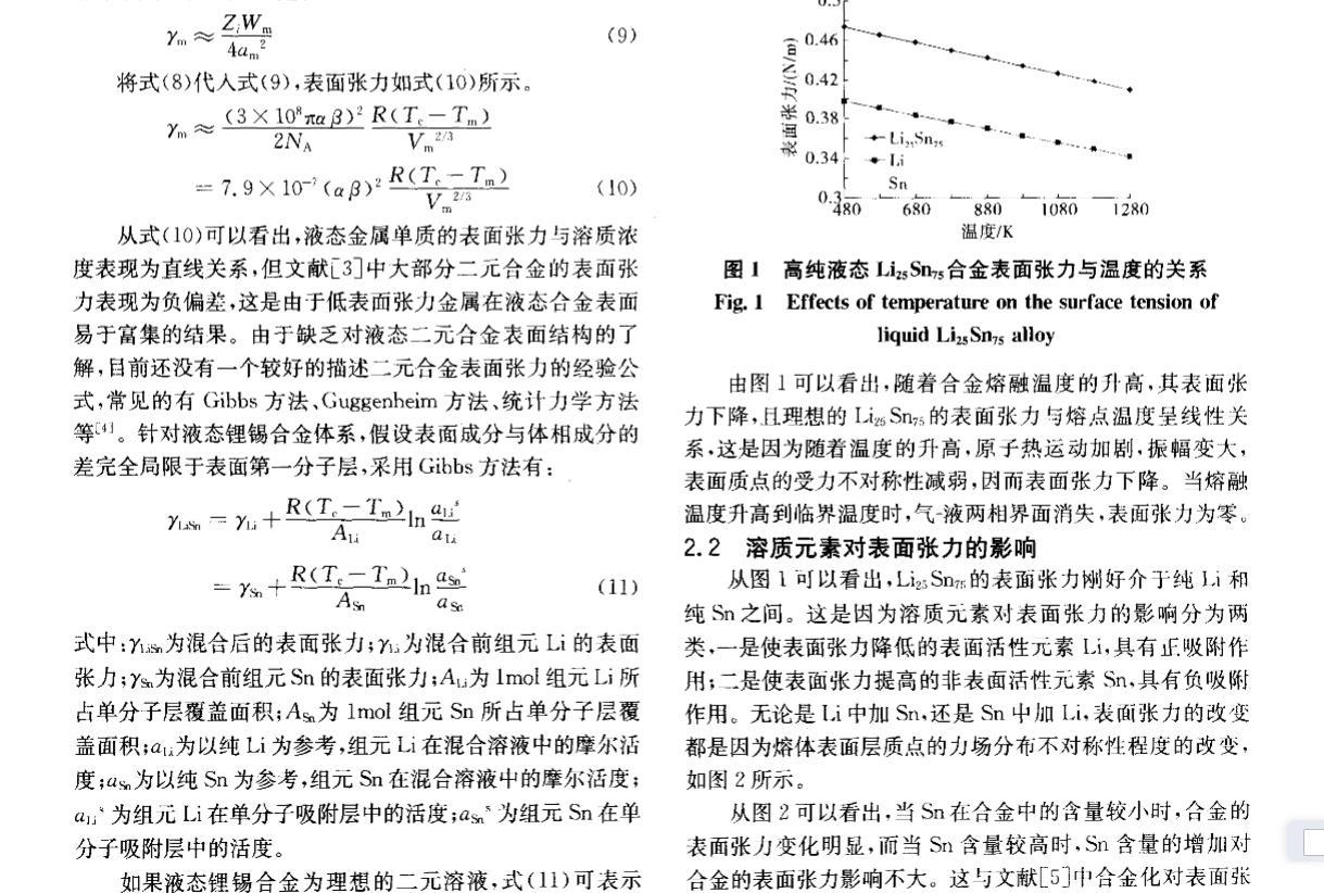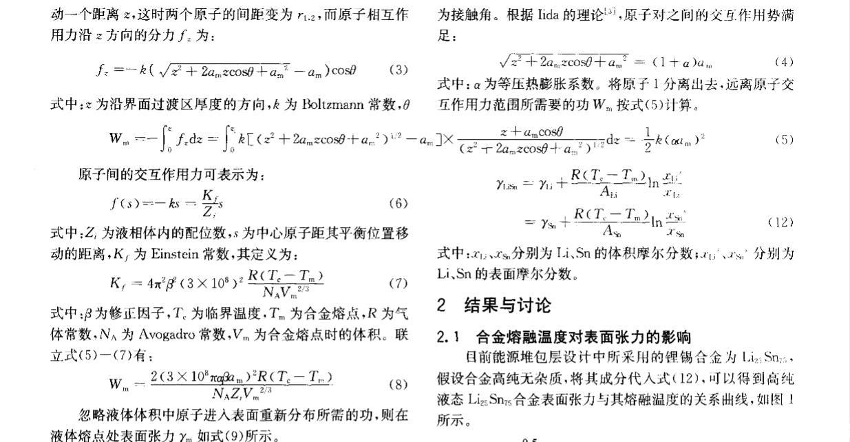 核能是公認(rèn)現(xiàn)實(shí)可行的、可大規(guī)模替代常規(guī)能源的清潔能源。聚變堆或聚變_裂變混合堆液態(tài)金屬包層因其固有特性和優(yōu)勢(shì),在國(guó)際上被普遍認(rèn)為是未來(lái)電站最具發(fā)展?jié)摿Φ陌鼘釉O(shè)計(jì)方案之一。作為包層氚增殖劑和冷卻劑的鋰錫合金與鋰鉛合金一樣,具有廣闊的發(fā)展前景,其制備、純化、質(zhì)量輸運(yùn)等工藝難題正逐步得到重視。液態(tài)金屬的表面張力不僅是認(rèn)識(shí)和理解冶煉過程最基本的物理量之一,而且是氣體吸收、氣泡形核、雜質(zhì)生長(zhǎng)等界面現(xiàn)象的控制因素。目前對(duì)液態(tài)金屬表面張力的研究多集中于金屬單質(zhì),合金的表面或界面行為在理論或?qū)嶒?yàn)上都相當(dāng)不足,主要是由于精確確定表面張力十分困難[2]。針對(duì)液態(tài)鋰錫合金這種新型的核材料,從基礎(chǔ)研究方面看,目前還沒有一種實(shí)驗(yàn)方法能確定液體界面的結(jié)構(gòu),即兩個(gè)相之間過渡區(qū)域的結(jié)構(gòu),因此需要有一些假設(shè)或模型來(lái)滿足表面張力理論的研究。
