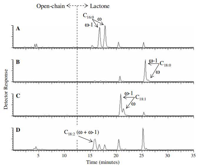 在4個SL中,只有一個SL-p的x-連桿總數大于x-1-連桿。 具體而言,在75%的棕櫚酸殘基中,39%通過x位置連接,36%通過x-1位置連接。 在其他情況下,大部分(至少71%)的脂肪酸通過x-1位置結合(亞油酸在所用LC方法下不可溶解,因此被報告為x和x-1組合結構)。 這些結果表明,為了形成內酯,糖苷鍵和酯鍵之間必須至少有15個甚至17個碳單元。 SL-o和SL-s中對x-1連接的極大偏好表明17個碳是內酯形成的首選碳。 然而,通過將棕櫚酸連接到x碳處的SL,鏈長度增加了1個碳單元(鍵間16個碳),使得內酯的形成比連接到x-1碳(鍵間15個碳)時更有利。 SL-p中存在C17:0脂肪酸含量較低(3%)的SLs進一步證實了這一點,而SL-s、SL-o和SL-l中沒有C17:0脂肪酸夾雜的跡象。 根據這些數據和二乙酰化內酯分布(見表2),得出結論,對于SL包裹體測試的單個脂肪酸,其優先順序為油酸、硬脂酸、棕櫚酸和亞油酸,以及C18脂肪酸, 單原子飽和優于飽和和雙不飽和。