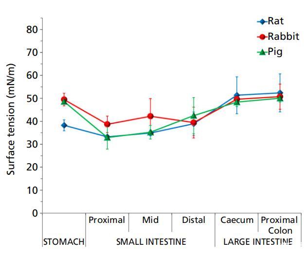 大鼠、兔和豬的胃腸液在整個(gè)腸道的表面張力明顯低于水的表面張力。這些動(dòng)物的表面張力遵循一般模式,胃的表面張力較高,小腸的表面張力較低,而遠(yuǎn)端腸道的表面張力再次升高(圖3,表1)。這種表面張力的行為也與腸道內(nèi)的消化過(guò)程相一致。小腸環(huán)境中的消化營(yíng)養(yǎng)物(如葡萄糖、氨基酸、脂肪酸)和消化分泌物(如膽汁)降低了該區(qū)域液體的表面張力,然后在遠(yuǎn)端腸道中重新吸收,從而產(chǎn)生更高的表面張力。