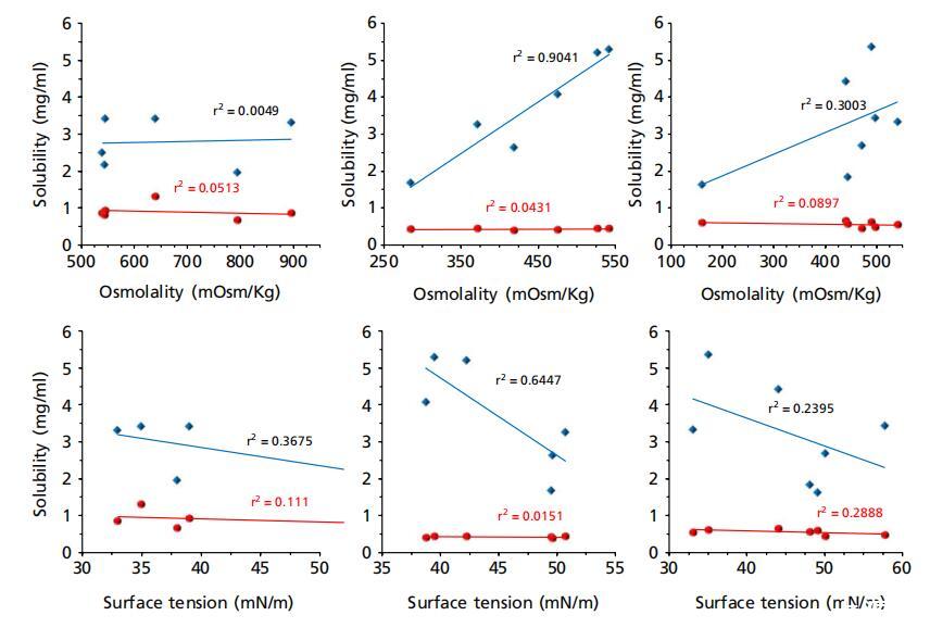 圖5:美沙拉秦(藍(lán)色鉆石)和潑尼松龍(紅色圓圈)在大鼠、兔和豬胃腸液(上清液)中的溶解度與其pH值、緩沖容量、滲透壓和表面張力的函數(shù)關(guān)系,其中藍(lán)色虛線(xiàn)表示除胃液外的美沙拉秦相關(guān)性。