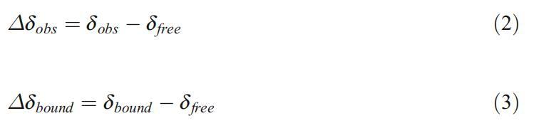 在任何給定的α-環糊精濃度下,結合表面活性劑分子的分數都可以通過其信號的化學位移來確定。客體分子在束縛態(δ束縛態)和自由態(δ自由態)有不同的化學位移。在自由形式和束縛形式之間的平衡以及這兩種狀態之間的交換率(比共振頻率差快)的情況下,將僅觀察到一個具有觀測到的化學位移(δobs)的信號,即δ束縛和δ自由之間的加權平均數。對于以下內容,我們定義了觀察到的化學位移變化(?δobs)和結合時化學位移的變化(?δ界):