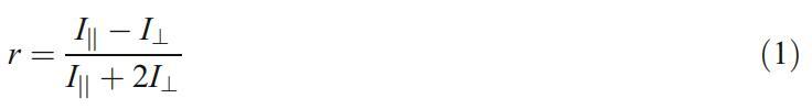 使用熒光偏振儀系統(Beacon 2000)在25.0±0.2°C下進行所有熒光各向異性測量。RB用作熒光探針,其濃度保持在0.1μM。分別使用570和630 nm的激發和發射波長測量熒光各向異性。當發射偏振器平行或垂直于偏振激發方向時,每個熒光強度稱為I||或I┴,分別地各向異性是強度差(I||-I)的比率┴)總強度(I||+2I)┴)如等式1[24,25]所示: