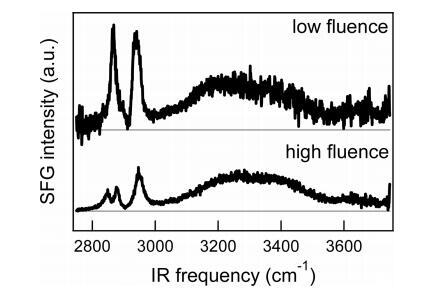 圖7。高密度水上DPPC的SFG光譜(SSP極化)(~每分子45?2)在低濃度下(~1.5 mJ/cm2)和高通量(~10 mJ/cm2),單脈沖加熱量分別在0.3至3°C(取決于紅外頻率)和2至19°C之間。為了清晰起見,對光譜進行了偏移,并根據相對紅外強度進行了縮放。注意,由于在高通量下發生的熱效應,形狀非常不同。這兩種光譜都是用非旋轉槽測量的。