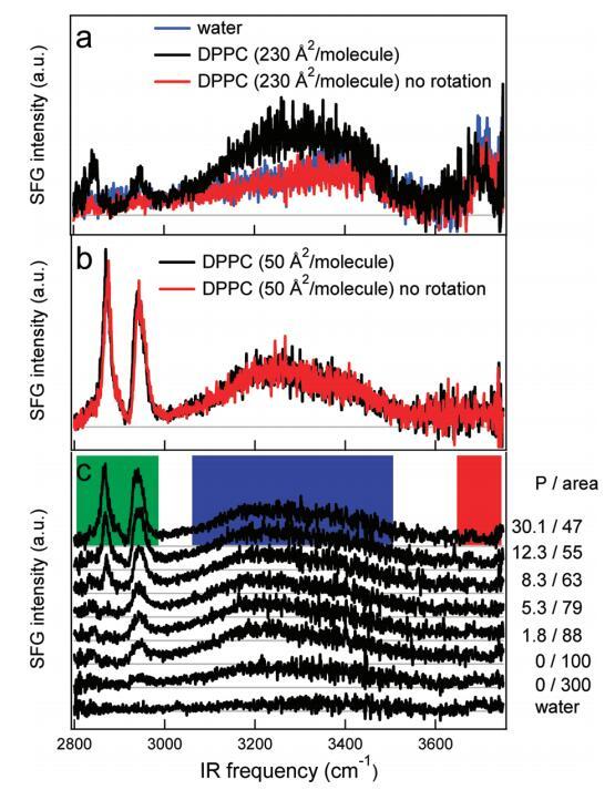 圖5。(a)DPPC在水上以230?2/分子(黑色)和不旋轉(紅色)槽的SSP極化的SFG光譜。樣品以這樣的方式旋轉:在激光焦點處,樣品以~0.06 m/s。不旋轉時,光譜與水相同?空中接口(藍色)。(b)在高密度(每個分子50?2)下,旋轉(黑色)和非旋轉(紅色)之間沒有區別。(c)裸露水面的SFG光譜(SSP極化)(底部光譜)和密度增加的水中DPPC的SFG光譜。壓力(mN/m)和每個分子的面積(?2)分別從底部到頂部增加和減少,在圖表旁邊給出。每個分子的面積由氯仿溶液滴的數量控制。彩色方塊標記了圖6中使用的積分區域。本實驗中使用了相對較低的紅外注量(1.5 mJ/cm2)。