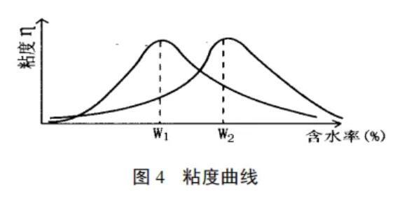 含水量高則流動性好(即每個顆粒表層水膜厚),但凝聚性差,坯體易變形。因此,對每一企業(yè)來講,在原料處理、擠泥機(jī)等條件固定的前提下,摸索一個合適的成型含水率,既利于擠泥機(jī)成型,又利于磚坯強(qiáng)度。根據(jù)我們對幾十種黏土的試驗(yàn)數(shù)據(jù),每種黏土都有一個最佳含水率,在這種含水率的情況下,黏土的粘性(稠度)最好。典型的粘度曲線(見圖4):