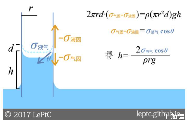 講到這里,我們已經(jīng)有三種方法來解釋這個(gè)現(xiàn)象了:①水想增加自己跟玻璃管內(nèi)壁的接觸面積,直到表面能的消耗不足以補(bǔ)償重力勢能;②固液接觸面的負(fù)張力把液體向上拉;③凹液面會(huì)降低液體內(nèi)的壓強(qiáng),從而外部氣壓把液體壓上來。三種方法都能推導(dǎo)出相同的結(jié)論,下圖中給出了第一種推法。