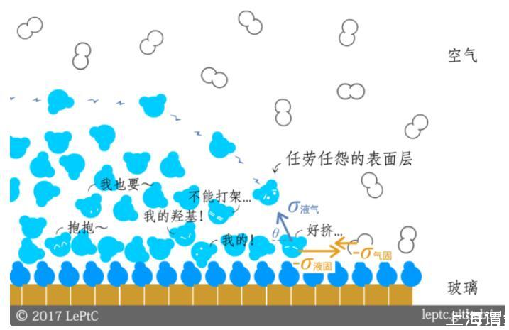 在氣體和液體之外,現(xiàn)在我們再加入新的角色——固體表面。玻璃的表面對水分子非常有吸引力(雖然玻璃的主要成分是二氧化硅,但它的表面通常會(huì)因?yàn)閮r(jià)態(tài)不飽和而結(jié)合很多羥基)。如果水滴碰到的界面是玻璃,就會(huì)出現(xiàn)跟空氣相反的情況:接觸面的水分子比平衡時(shí)更擠,表面張力是擴(kuò)張的,表面能是負(fù)的,整坨水滴會(huì)希望自己跟玻璃的接觸面積越大越好(同時(shí)跟空氣接觸面積越小越好),形成特定的接觸角θ。這個(gè)角越小,意味著固體表面的親水性越強(qiáng)。