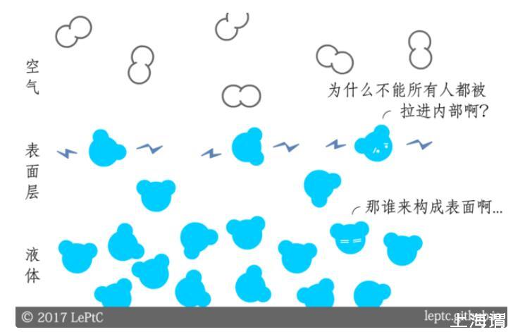 假設(shè)上下兩部分的壓強(qiáng)相同(壓強(qiáng)不同的情況將在第二節(jié)介紹),由于空氣對水分子的吸引力小于水分子之間的吸引力,所以位于表面的水分子會(huì)受到指向液體內(nèi)部的力,一部分水分子被拉進(jìn)液體內(nèi)部,表面層的水分子開始變稀疏,直到吸引力減弱到和空氣接近時(shí)趨于平衡。表面層水分子的間距大于r0,因此吸引力占上風(fēng):