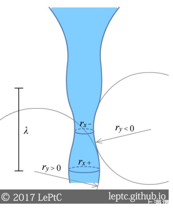 這一現(xiàn)象稱為普拉托-瑞利不穩(wěn)定性(Plateau–Rayleigh instability)。我們在柱狀界面上加一個(gè)波長為λ的擾動(dòng),橫截面上的曲率變化rx是促進(jìn)柱的分裂的,但縱截面上ry的曲率變化會(huì)阻礙分裂,后者的效應(yīng)隨λ變長而減弱。