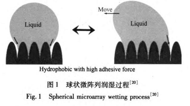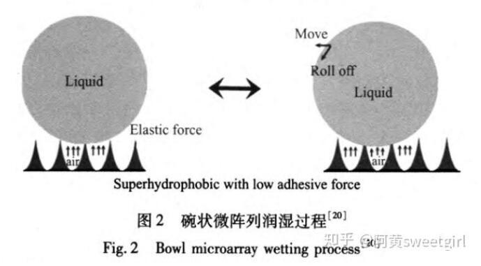 有評論說疏水高粘附的界面也會存在,然而這是具有特殊微納米結構的表面,比如玫瑰花瓣等,這類的界面對微結構的幾何性質要求較高。而通常的情形下,微納米結構的存在會使疏水的界面出現超疏水的現象,其粘附力會更低,比如荷葉的表面。如下圖中,上面的是疏水高粘附,下面是疏水低粘附的界面,然而這時由水與界面的接觸面積決定的,接觸面積越大,其粘附力越大,否則會越小。這是在化學性質相同時,從微結構的角度考慮的粘附力。這種疏水高粘附是與平整的高粘附界面相互比較來說的,然而其是否一定比親水的物質粘附力大未曾可知。