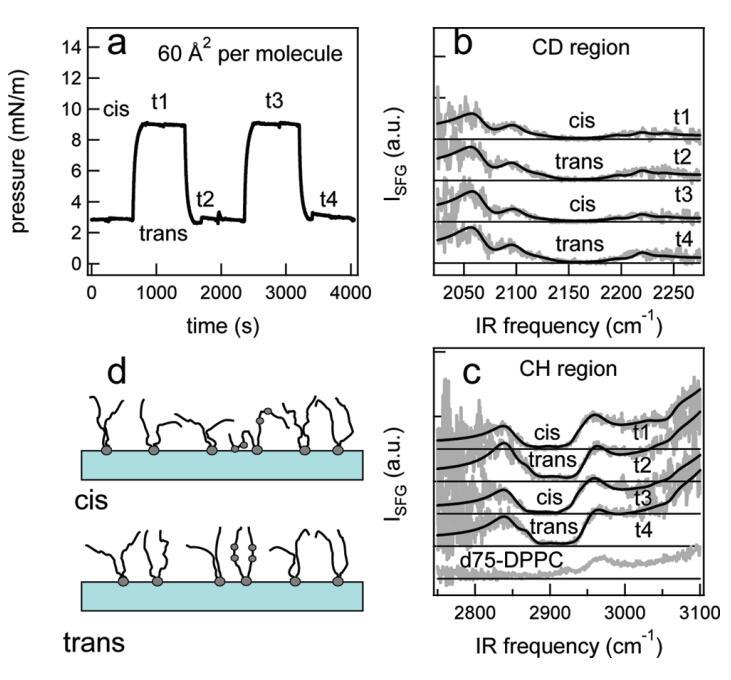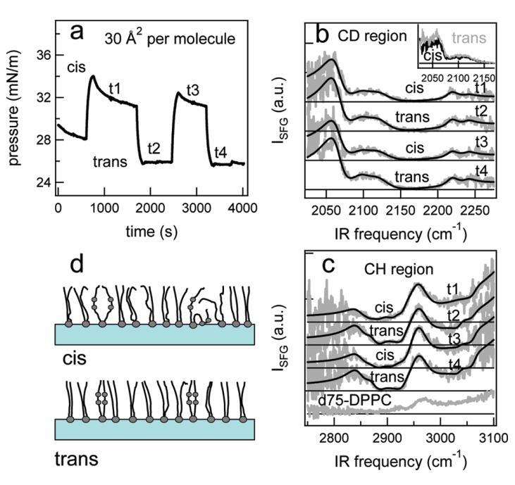 圖6:結果:DT Azo-5P/d75 DPPC的1:5混合物在脂質/水界面上的面積為60?2/分子。(a)表面壓力與時間的關系。370和450 nm光照射~100秒分別產生cis(高壓)和trans(低壓)狀態(tài)。壓力的微小劇烈波動是由于樣品高度的變化,以校正水的蒸發(fā)。(b)相應的VSFG光譜(灰色)以及CD區(qū)域的擬合。為了清晰起見,對光譜進行了偏移。(c)VSFG光譜(灰色)與fits一起引導眼睛進入CH區(qū)域。底部曲線顯示了P下純d75 DPPC的光譜~40 mN/m.(d)脂尾方向示意圖。光開關脂質的偶氮苯部分用灰色圓圈表示。