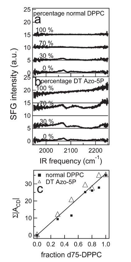 圖9:。(a)正常DPPC和d75 DPPC不同混合物的CD區(qū)VSFG光譜。圖中給出了混合物中正常DPPC的百分比。為清晰起見,光譜偏移,細線表示零。(b)與a部分類似,但適用于DT Azo-5P與d75 DPPC的混合物。(c)通過擬合VSFG光譜獲得的CD振動振幅之和,如文中所述,作為含正常DPPC或DT Azo-5P的二元混合物中分數d75 DPPC的函數。在本實驗中,為了獲得混合物的高質量數據,紅外注量很高,導致通過VSFG光譜中相對較高的CH2和CD2振幅觀察到的脂質尾部出現小的無序。