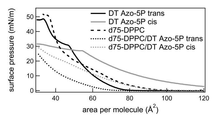 圖2:反式和順式狀態(tài)下的光開關脂質DT Azo-5P的表面壓力與面積等溫線(實線),d75-DPPC的表面壓力與面積等溫線(虛線),以及光開關兩種狀態(tài)下的1:5摩爾比的光開關脂質與d75 DPPC的表面壓力與面積等溫線(虛線)。