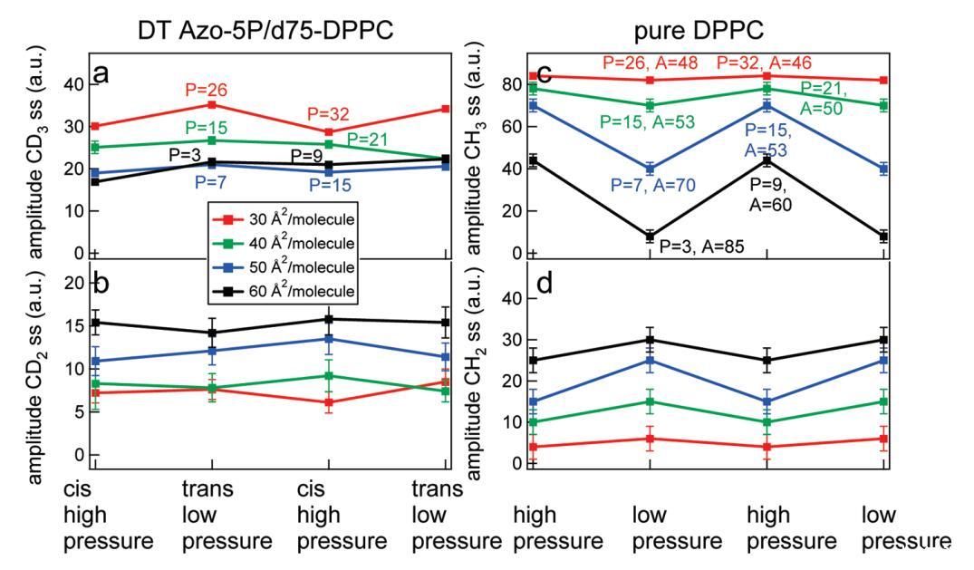 圖8:。d75 DPPC與DT Azo-5P比例為5:1的實驗中d75 DPPC的擬合結果(左)和純正常DPPC的擬合結果(右)。(a)CD3對稱拉伸振動模式的振幅隨不同密度光開關脂質狀態(tài)的變化;(b)CD2對稱拉伸振動模式的振幅隨不同密度光開關脂質狀態(tài)的變化;右圖顯示了純DPPC在可比壓力下與左圖相似的結果,其中(c)為CH3對稱拉伸振動模式的振幅,(d)為CH2對稱拉伸模式的振幅。共振的寬度和頻率在擬合中是固定的。