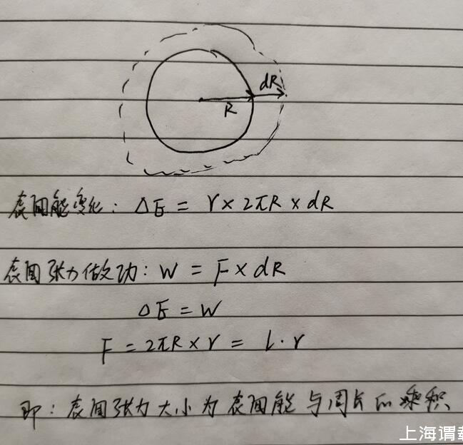 假設(shè)一半徑為R的圓面向外擴張距離為dR,這個過程表面張力做功等于表面能的變化。具體推導(dǎo)如下圖。