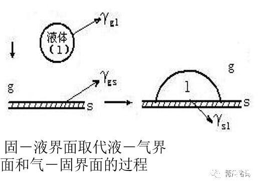 固體浸于液體中的過程稱為浸濕。此過程是固氣界面被固液界面取代,氣液界面無變化,此過程自由能變化為