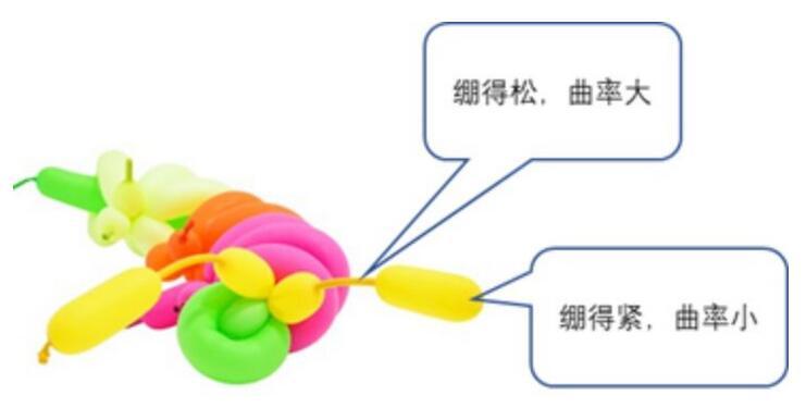 很顯然,一個(gè)決定因素就是張力的大?。浩つた嚨脑骄o,所能產(chǎn)生的壓力差就越大。但是還有另一個(gè)很重要的因素,就是表面彎曲的程度,也就是它的曲率。我們還是用氣球做一個(gè)說明,例如下面這個(gè)氣球:
