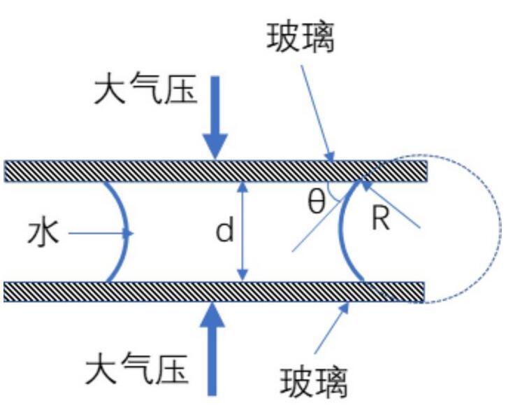 我們可以想象,當(dāng)兩片玻璃間隙非常小的時(shí)候,這個(gè)凹液面的曲率就會(huì)非常大,在這個(gè)時(shí)候,液體壓力與大氣壓的差就會(huì)很大,因此把玻璃擠壓在一起的力也就很大。我們可以用楊-拉普拉斯公式來估算一下。
