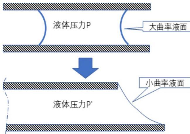 但是當(dāng)我們向著玻璃縫隙滴幾滴水,哪怕只是很少的幾滴,它們之間就不再牢固了,隨著水的不斷滴入,最后就不可避免地分開了。這是因?yàn)榈稳胨粩噙M(jìn)入縫隙,最后就會(huì)破壞掉前面所述的曲率很大的液面,導(dǎo)致液體壓力與外界氣壓的差迅速降低,于是它們就無法繼續(xù)沾在一起了。這個(gè)過程可以圖示如下: