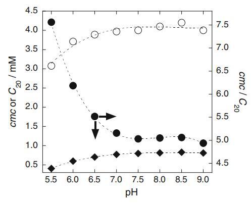 圖4 cmc、C20和cmc/C20比值與pH的關系圖:白色圓圈cmc、黑色菱形C20、黑色圓圈cmc/C20