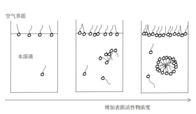 我們在文章開頭介紹過,表面活性劑是一種兩親的分子,一頭親水一頭親油。因此,低濃度時(shí)表面活性劑傾向于留在水的表面,親油(厭水)的一頭朝外,首先布滿水面,也就是水-空氣界面,所以會(huì)降低這個(gè)界面的張力。