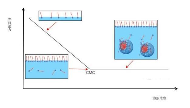 但是當(dāng)濃度超過一個(gè)點(diǎn)時(shí),表面活性劑會(huì)開始抱團(tuán),形成膠束,界面張力不再下降,這個(gè)濃度叫做臨界膠束濃度。