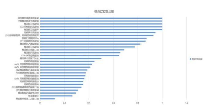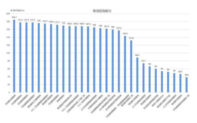 通過對比和排序,我們很快就能篩選出起泡能力好的表活劑,同時(shí)也能得到表活劑的起泡規(guī)律:(ps:由于相同原料出于不同廠商,其泡沫性能也存在差異,此處用不同大寫字母代表不同的原料廠商)