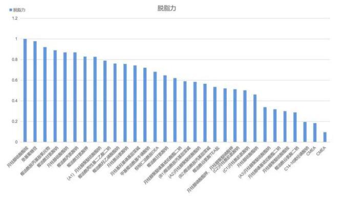 從上述數(shù)據(jù)中可以看出,在規(guī)定條件下,脫脂力最強(qiáng)的是月桂醇硫酸酯銨,脫脂力最弱的是兩款CMEA;