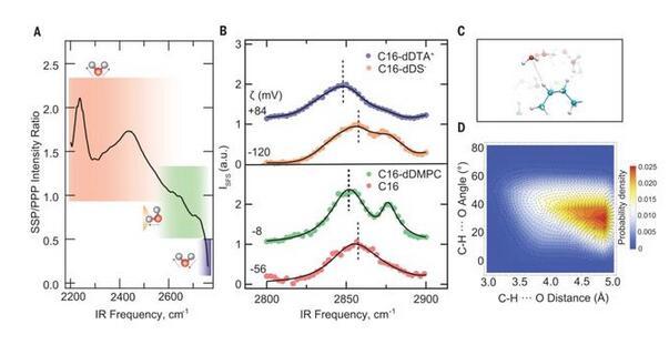 十六烷液滴在D2O中的SFS光譜中~100 cm?1的相當(dāng)大的頻率偏移(由灰色峰形突出)表明,電荷必須從水的O–D基團(tuán)轉(zhuǎn)移到油相的十六烷C-H基團(tuán)上,因?yàn)樗鼈兪墙邮茈娮用芏鹊奈ㄒ缓蜻x基團(tuán)。如果存在如此強(qiáng)的相互作用,即可以預(yù)期油分子的振動(dòng)模將經(jīng)歷向與高頻O-D模相反的方向移動(dòng)。這種遷移應(yīng)伴隨著結(jié)構(gòu)的變化,如C–H???O H鍵的存在。為了研究這一點(diǎn),記錄了界面C-H模的SFS譜,并進(jìn)行了MD模擬。界面C-H模的SFS譜圖顯示了CH 2(CH 2-ss)和CH 3(CH 3-ss)的對(duì)稱(chēng)拉伸模在~2850和~2878 cm?1附近。十二烷-水界面顯示水和油分子相互作用讓人聯(lián)想到水和油之間的H鍵。作為C-H鍵的弱H鍵的受體,水分子上的O孤對(duì)提供了一些電子密度,使十二烷分子帶一個(gè)負(fù)電荷。