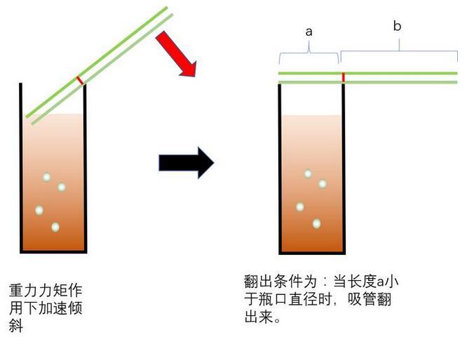 達(dá)到位置最高時,速度為零,這時,重力大于浮力,重力矩的作用下,加速傾斜。那么什么情形下,吸管會翻出來呢?顯然是吸管翻出時,不被瓶壁阻擋時,才可以翻出來。