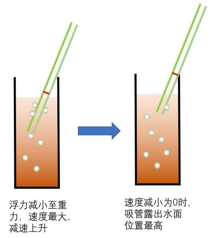 這時上升過程中,吸管可能因為左右兩側(cè)吸附的氣泡數(shù)量不同而發(fā)生浮力差異而傾斜。也可能因為外界擾動而發(fā)生傾斜,反正吸管豎直上升的可能性很小。習(xí)慣傾斜碰到瓶壁后繼續(xù)上升,上升帶來氣泡的減少,吸管自身浮力的下降。當(dāng)浮力減小到小于重力時,這時開始i減速,直到速度為零。如下圖所示;