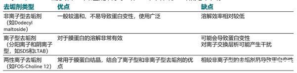 去垢劑的選擇:去垢劑別名表面活性劑、乳化劑、肥皂等等,分為離子型、非離子型和兩性離子型三類。去垢劑是同時具有親水性和疏水性基團的雙極性分子,能夠使磷脂雙分子層解體并釋放膜蛋白,并且為去膜狀態下的膜蛋白提供穩定的疏水環境。去垢劑也需要篩選合適的種類和濃度,各自優缺點見下圖。
