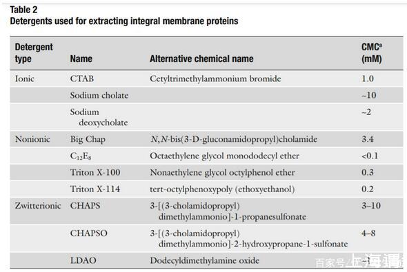 為了溶解得到跨膜蛋白,破壞膜雙層結構是必要的。通常使用去垢劑的方法。去垢劑是一種兩性分子,同時包含疏水和親水的部分,并且在水中會形成膠束。膠束是去垢劑親水頭向外,疏水頭向內排列的聚集體形式。去垢劑溶解蛋白通過一端結合蛋白的疏水部分,另一端結合親水部分。去垢劑的選擇應該足夠溶解膜蛋白而不會造成不可逆的變性。常見的去垢劑見表二。