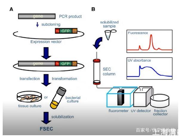 FSEC用于表達條件和去垢劑的快速篩選。FSEC(Fluorescence-Detection Size-Exclusion Chromatography),又叫熒光檢測尺寸排阻色譜法。具體方法是將目的基因構建在帶有GFP標簽的融合表達載體上,進行小量表達。通過不同的去垢劑溶解后,然后上樣微量色譜柱,使用AKTA系統的紫外,熒光檢測器進行檢測(熒光檢測器需搭配)。由于目的蛋白帶有GFP標簽,使用熒光檢測會顯示出熒光信號。通過峰型和峰面積我們可以檢測到蛋白表達和溶解情況。