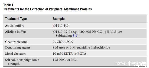 外周膜蛋白可以使用相對溫和的技術來分離,破壞外周膜蛋白和細胞膜之間的靜電作用或者氫鍵,而不破壞整個細胞膜。通常使用的試劑參見表一。使用含有高鹽離子濃度的緩沖液進行提取很有用因為他們會降低膜蛋白和帶有電荷的脂質之間的靜電相互作用。