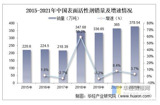 2015-2021年中國表面活性劑銷量及增速情況