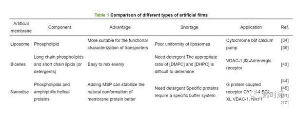 與雙胞體一樣,納米盤的第一步是基于洗滌劑的增溶,需要優(yōu)化所使用的洗滌劑的性質(zhì)和濃度,這在納米盤重組中可能造成蛋白質(zhì)活性損失,因此同樣存在洗滌劑使用相關(guān)問(wèn)題的限制。表1[34,35,41-45]比較了脂質(zhì)體、雙胞體、納米盤的組成及其優(yōu)缺點(diǎn)。