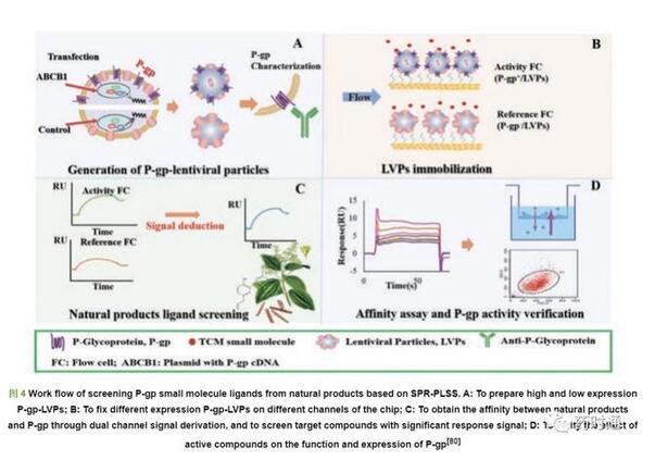 針對(duì)慢病毒載體穩(wěn)定技術(shù)結(jié)合SPR在中藥活性成分篩選中的應(yīng)用,本課題組已展開一些探索性研究。P-糖蛋白(P-gp)是體內(nèi)最重要的外排型轉(zhuǎn)運(yùn)蛋白,具有12次跨膜的復(fù)雜結(jié)構(gòu),且尚未商品化。Cao等[80]采用LVPs穩(wěn)定策略,獲得活性良好的P-糖蛋白,構(gòu)建了一種基于SPR的P-糖蛋白配體篩選系統(tǒng)。首先,獲得P-gp高表達(dá)和低表達(dá)的LVPs,然后將P-gp高/低表達(dá)的LVPs分別固定在CM5芯片上作為活性通道和參比通道。以P-gp抑制劑伐司樸達(dá)(valspodar,Val)和環(huán)孢素(cyclosporin,CsA)為陽(yáng)性對(duì)照,從天然產(chǎn)物庫(kù)中快速篩選出厚樸酚、和厚樸酚和白藜蘆醇作為潛在的P-gp配體(圖4)[80]。Chen等[81]構(gòu)建了CXCR4的配體篩選體系,將高/低表達(dá)的CXCR4的慢病毒顆粒固定在CM5芯片上,以趨化因子受體拮抗劑AMD3100為陽(yáng)性化合物,從川芎提取物中篩選出洋川芎內(nèi)酯Ⅰ為CXCR4的潛在配體。