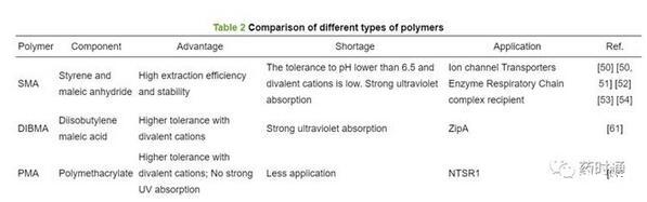 盡管SMA和DIBMA在一些MPs的分離純化中取得了成功[63],但存在SMA對(duì)二價(jià)陽(yáng)離子耐受性低、DIBMA提取純度和穩(wěn)定性低的缺陷并且這兩種聚合物都有強(qiáng)烈的紫外吸收,可能干擾紫外檢測(cè)[57]。因此人們開始尋找非“烯烴-馬來(lái)酸支架”替代聚合物。最近,兩親性聚甲基丙烯酸酯聚合物(polymethacrylate,PMA)被證明可將脂質(zhì)雙分子層溶解成納米圓盤。PMA比常見的苯乙烯-馬來(lái)酸聚合物具有潛在的優(yōu)勢(shì),但目前PMA對(duì)于MPs的純化應(yīng)用較少[64]。Lavington等[63]以神經(jīng)緊張素受體1(NTSR1)為對(duì)象,探索使用PMA的無(wú)洗滌劑純化。通過(guò)使用Sf9細(xì)胞中表達(dá)的NTSR1-eGFP融合蛋白,篩選了一系列的增溶條件,證明了溫度、pH、NaCl濃度以及聚合物和膜樣品的相對(duì)數(shù)量的重要性。此外還發(fā)現(xiàn)PMA對(duì)二價(jià)陽(yáng)離子有一定耐受性。PMA溶解的NTSR1比洗滌劑溶解的NTSR1表現(xiàn)出更大活性,這表明PMALPs為NTSR1提供了更天然的膜環(huán)境[63]。因此,PMA是一種可替代SMA的MPs純化方法,在研究NTSR1和其他MPs方面具有良好的前景。表2比較了SMA、DIBMA、PMA的組成、優(yōu)缺點(diǎn)及其應(yīng)用。