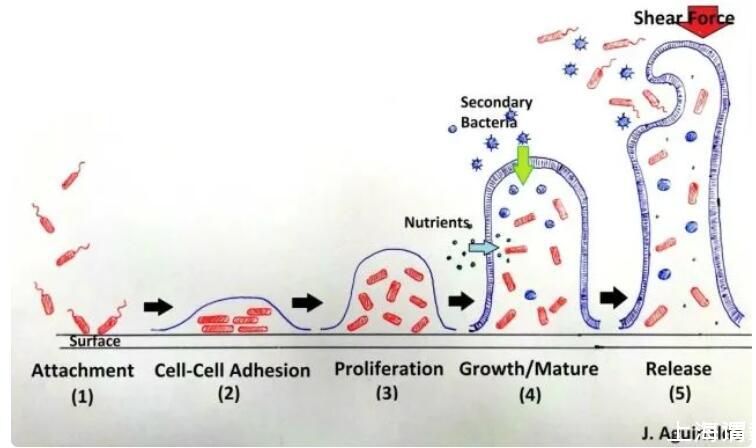 生物膜對(duì)微生物起保護(hù)作用,并會(huì)持續(xù)接納新的浮游微生物。傳統(tǒng)的清潔、消毒方式可以殺滅生物膜下部分微生物,但無法有效去除由胞外聚合物構(gòu)成的生物膜。如果在清潔消毒后,系統(tǒng)中微生物依然頻繁超標(biāo),很可能已存在生物膜污染。