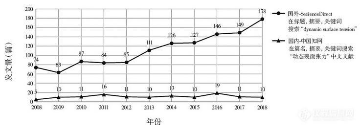 當(dāng)研究的液體吸附過程在快速、持續(xù)進(jìn)行,且短時間內(nèi)無法達(dá)到平衡時,對液體DST的研究比靜態(tài)表面張力更有意義。如在農(nóng)藥噴灑、噴墨印刷、織物快速潤濕,以及攝影用薄膠片制備中。圖1對比了近10年(2008~2018年)國內(nèi)外發(fā)表的以DST為主要考察項的論文數(shù)。數(shù)據(jù)顯示國內(nèi)在DST方面的研究較少且總體波動不大,而國外則呈持續(xù)上升趨勢。