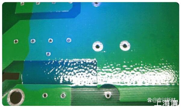 三防漆噴涂后,一般三防漆在PCB板自流平,有些自動化的噴涂工藝流平是通過傳送帶的速度來控制放置時間,稀釋劑揮發(fā)快,粘度高,導致未流平的區(qū)域流不平,出現(xiàn)表面凹凸現(xiàn)象,也就是桔紋現(xiàn)象。