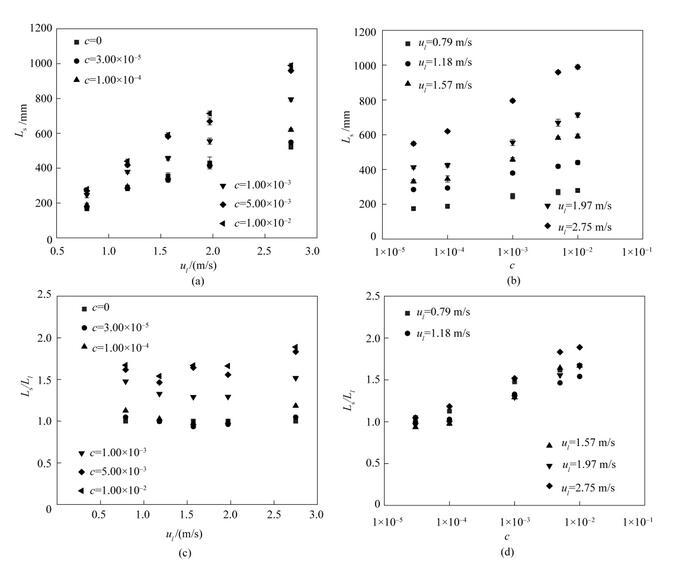 為了定量表征表面張力變化對射流破裂過程的影響,實(shí)驗(yàn)測量了含表面活性劑射流的射流破裂長度。射流破裂長度定義為噴嘴出口至射流首次發(fā)生破裂處的距離。圖6是含表面活性劑射流破裂長度隨射流速度u l的變化趨勢,其中L s(mm)表示含表面活性劑射流的射流破裂長度,L l(mm)為水的射流破裂長度。從圖6(a)中可以看出,當(dāng)表面活性劑濃度保持不變時,提高液體射流速度會增大射流破裂長度。從圖6(b)中可以看出,當(dāng)液體射流速度保持不變時,隨著表面活性劑濃度的增大,射流破裂長度總體上呈現(xiàn)逐漸增大的趨勢;射流速度越大,射流破裂長度增大的趨勢就越明顯。使用相同工況下水的射流破裂長度無量綱化含表面活性劑射流的破裂長度后,可以得到射流破裂長度比隨射流速度以及表面活性劑濃度的變化趨勢,如圖6(c)、(d)所示。從圖中可以看出,表面活性劑的加入顯著增大了射流破裂長度比。在表面活性劑濃度不變時,提高液體射流速度對射流破裂長度比的影響并不顯著。在射流速度保持不變時,提高表面活性劑濃度會導(dǎo)致射流破裂長度比的增大。