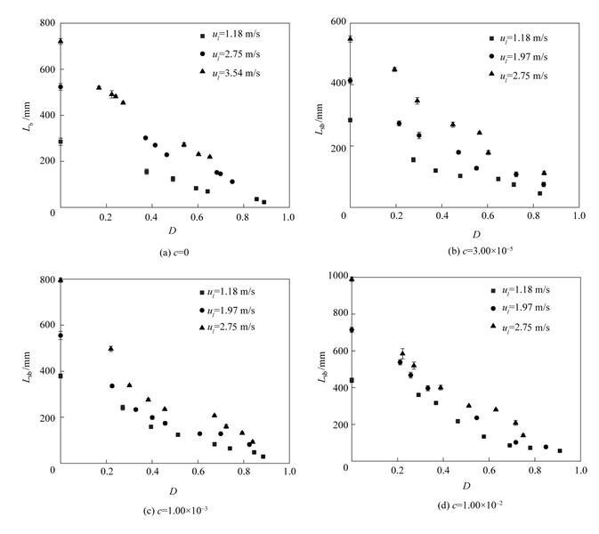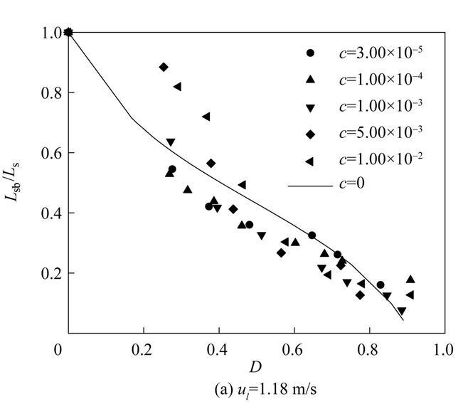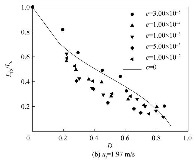 圖11是不同濃度表面活性劑射流破裂長度L sb隨氣泡無量綱直徑D=d b/d 0(d b為氣泡直徑)的變化。從圖中可以看出,不同表面活性劑濃度下,射流破裂長度隨氣泡無量綱直徑D的變化趨勢是相似的。射流破裂長度隨著氣泡直徑的增大逐漸減小;當(dāng)氣泡直徑相同時,提高液體射流速度會導(dǎo)致更大的射流破裂長度。