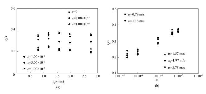 從圖7(a)中可以看出,當(dāng)表面活性劑濃度保持不變時,射流破裂時間幾乎不隨射流速度的改變而改變。在射流速度保持不變時,隨著表面活性劑濃度的增大,射流破裂時間呈現(xiàn)逐漸增長的趨勢。在實(shí)驗(yàn)參數(shù)范圍內(nèi),射流破裂時間均小于0.4 s。考慮重力對液體射流的加速作用,液體射流實(shí)際破裂時間要小于0.4 s。