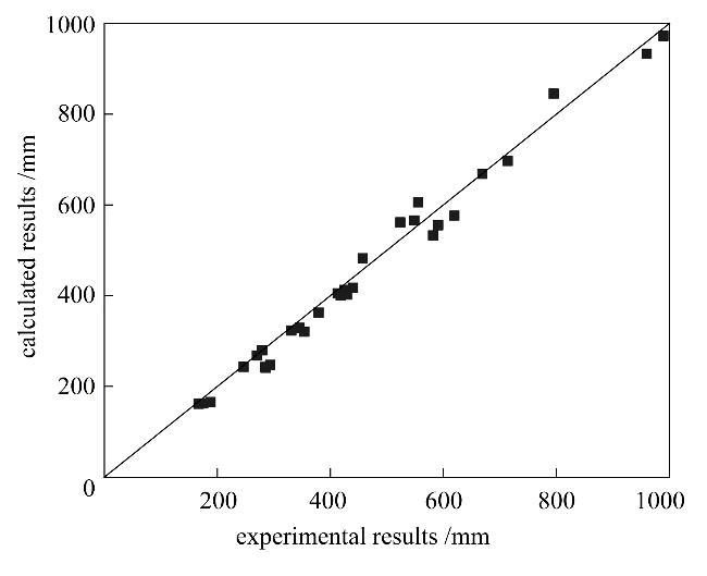 圖9射流破裂長度實(shí)驗(yàn)測量值與擬合計算值的比較Fig.9Comparison between experimental results and calculated results