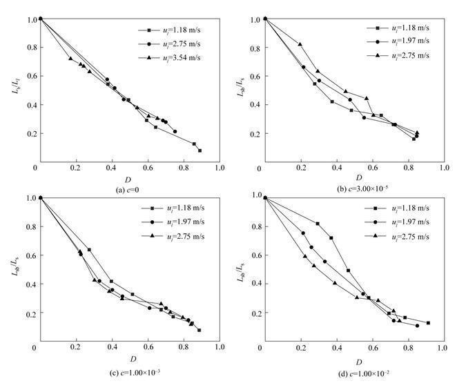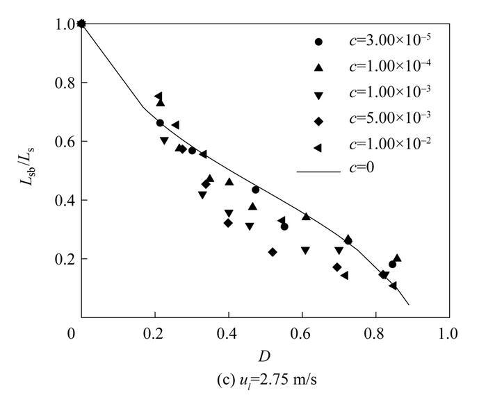 如圖12所示,當(dāng)氣泡直徑較大時,破裂長度比基本不隨射流速度的改變而改變。這是由于此時氣泡引起的射流速度擾動對射流破裂的影響占主導(dǎo)地位。在氣泡直徑較小時,當(dāng)表面活性劑濃度c<1.00×10-2,不同射流速度下射流破裂長度比基本相同。當(dāng)表面活性劑濃度c=1.00×10-2,破裂長度比隨著射流速度的增大而逐漸減小。這可能與被削弱的Marangoni效應(yīng)有關(guān)。由式(10)可知,液體射流速度越大,液體對流造成的表面活性劑表面吸附量減少的趨勢越強(qiáng),波峰波谷間的表面張力差值越小,Marangoni效應(yīng)越弱,射流破裂長度增加的趨勢越弱。因此,在氣泡較小時,隨著射流速度的增大,含氣泡射流的破裂長度比逐漸減小。在表面活性劑濃度較小時,氣泡的存在進(jìn)一步減小了射流內(nèi)部表面活性劑的濃度,從而使得不同射流速度下Marangoni效應(yīng)的差別不明顯,不同射流速度下射流破裂長度比基本相同。