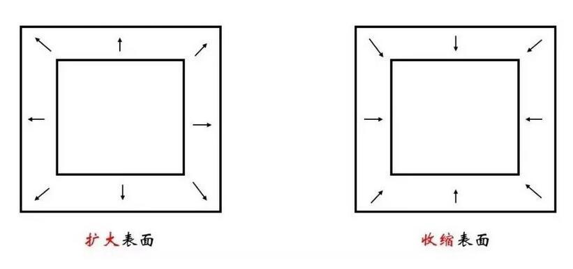 油墨不溶于水,當它接觸到水的一瞬間就會立刻擴散開來。油墨的擴散會帶來水表面上面積的增大,如下圖所示。而擴大表面就會給船帶來一定力的作用,從而造成船的運動。